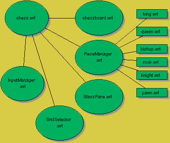 Take as an example, the chess vrml application to the right. The top level vrml file here is chess.wrl. It Inlines chessboard.wrl and contains ExternProtos with Protos contained in PieceManager, InputManager, GlassPane, and GridSelector. PieceManager itself has ExternProtos for king, queen, bishop, rook, knight and pawn.